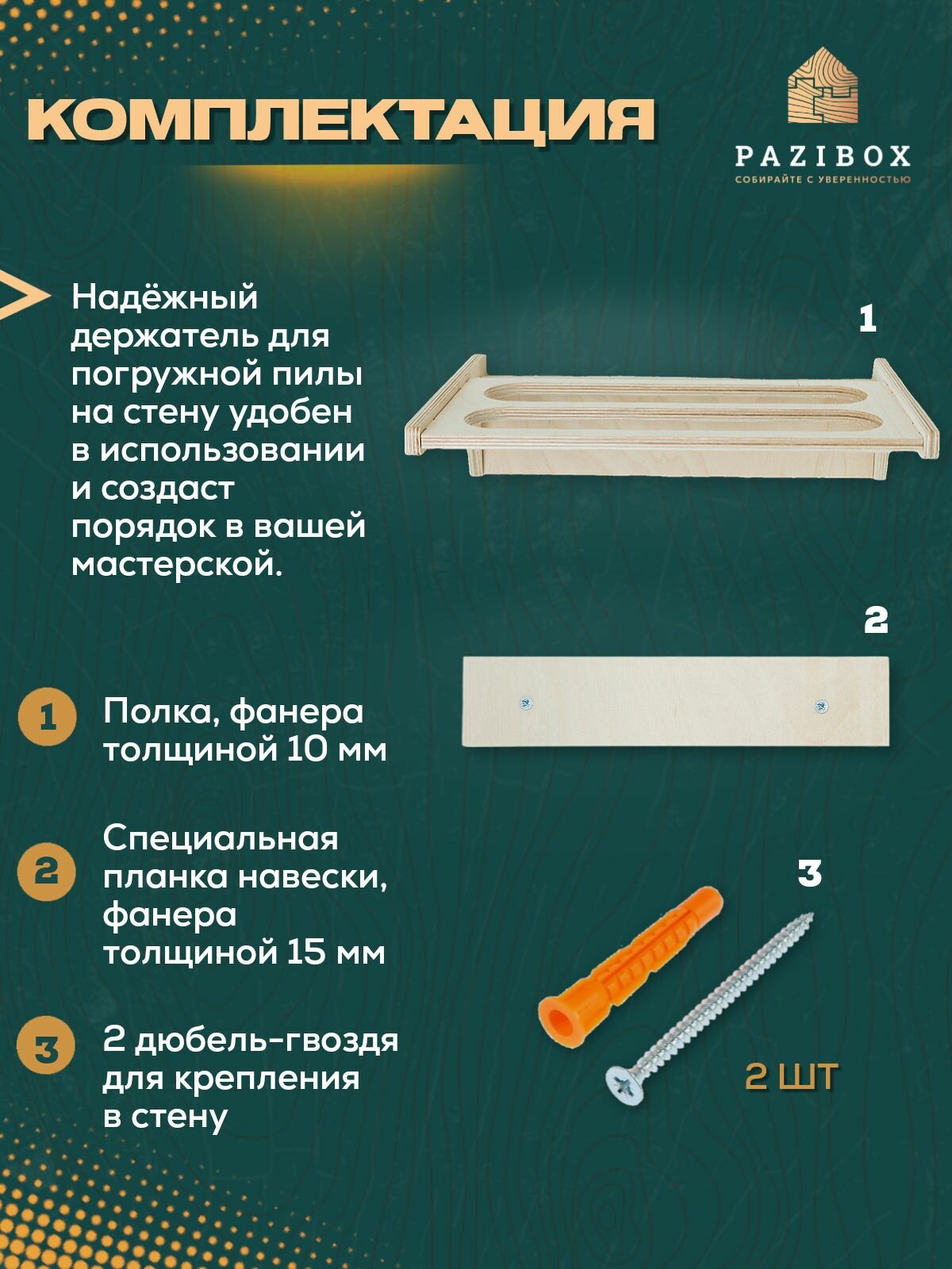| Комплектация | В комплект входит держатель погружной пилы, планка под размер полки и два дюбель-гвоздя для крепления на стену. |