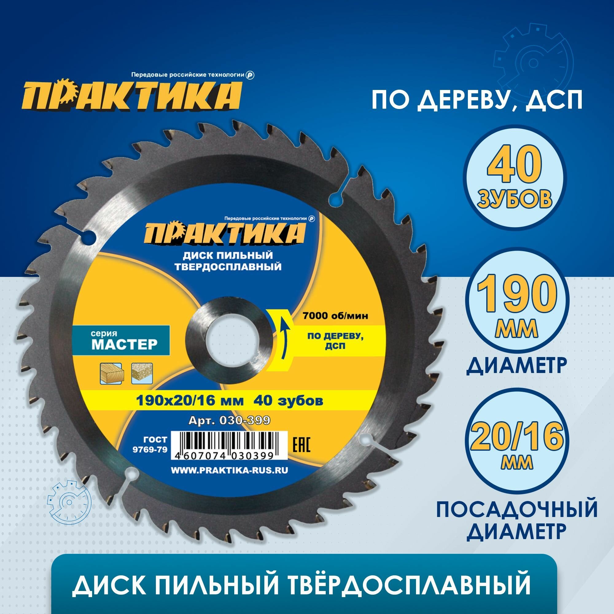 10 цен на Диск пильный твердосплавный по дереву, ДСП ПРАКТИКА 190 х 20-16 мм, 40 зубов