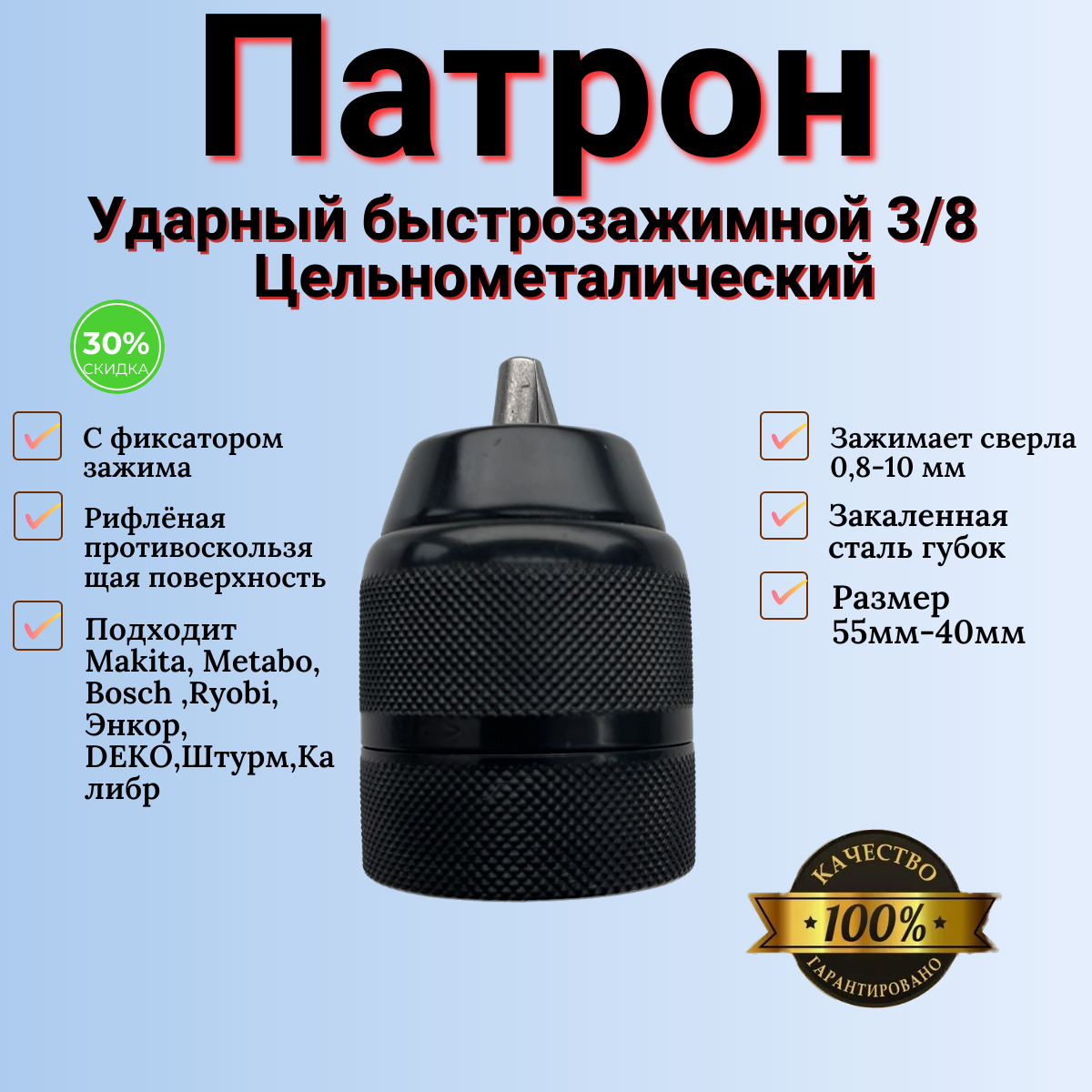 | Дополнительная информация | Патрон цельнометаллический 10мм 3/8 |