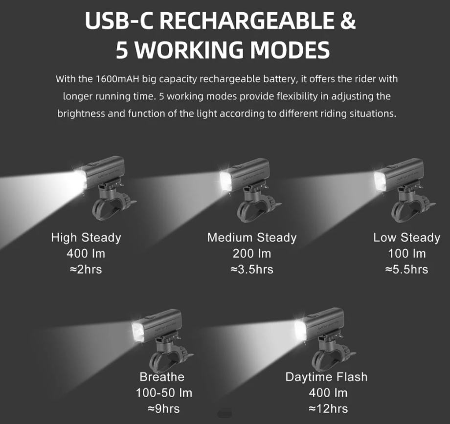 Отзывы на Фара велосипедная GACIRON с велофонарем KIWI, 400 люмен, 5 режимов, USB-зарядка