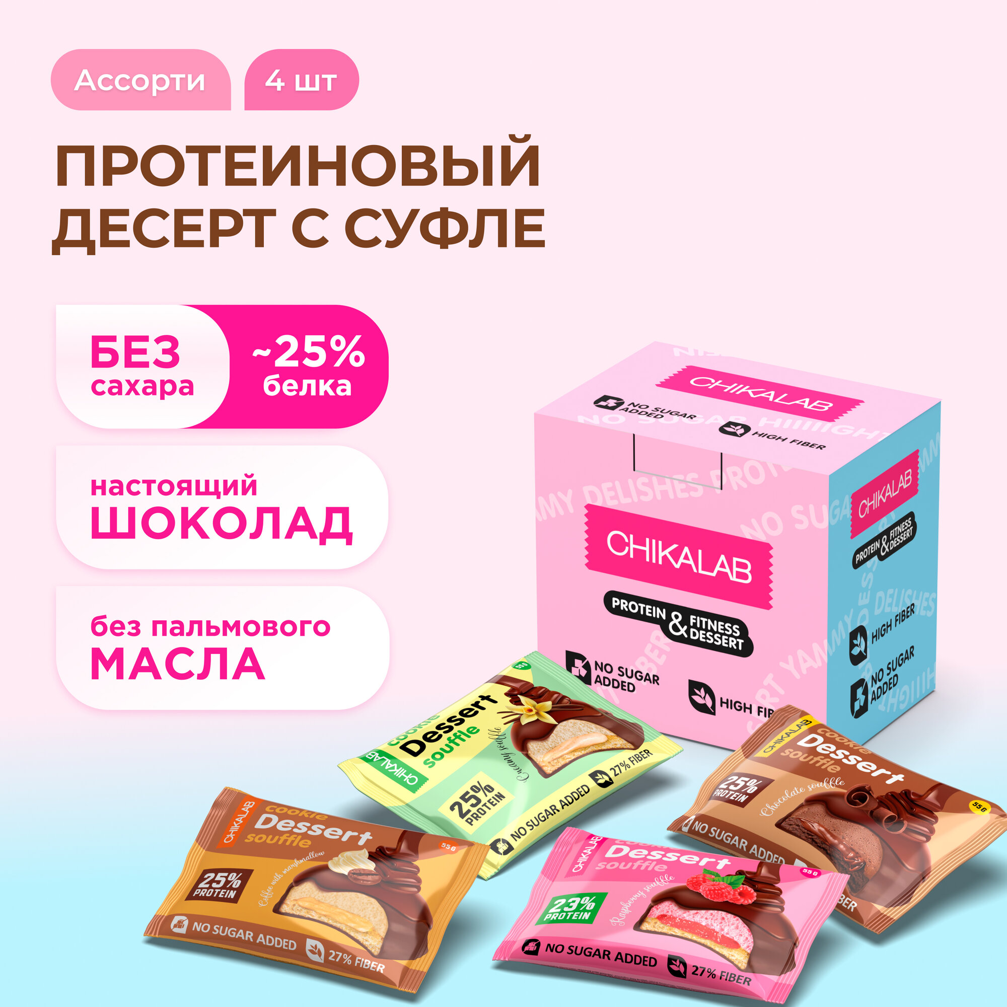 CHIKALAB Протеиновое печенье с суфле в шоколаде без сахара "Ассорти-мини", 4шт х 55г информация: