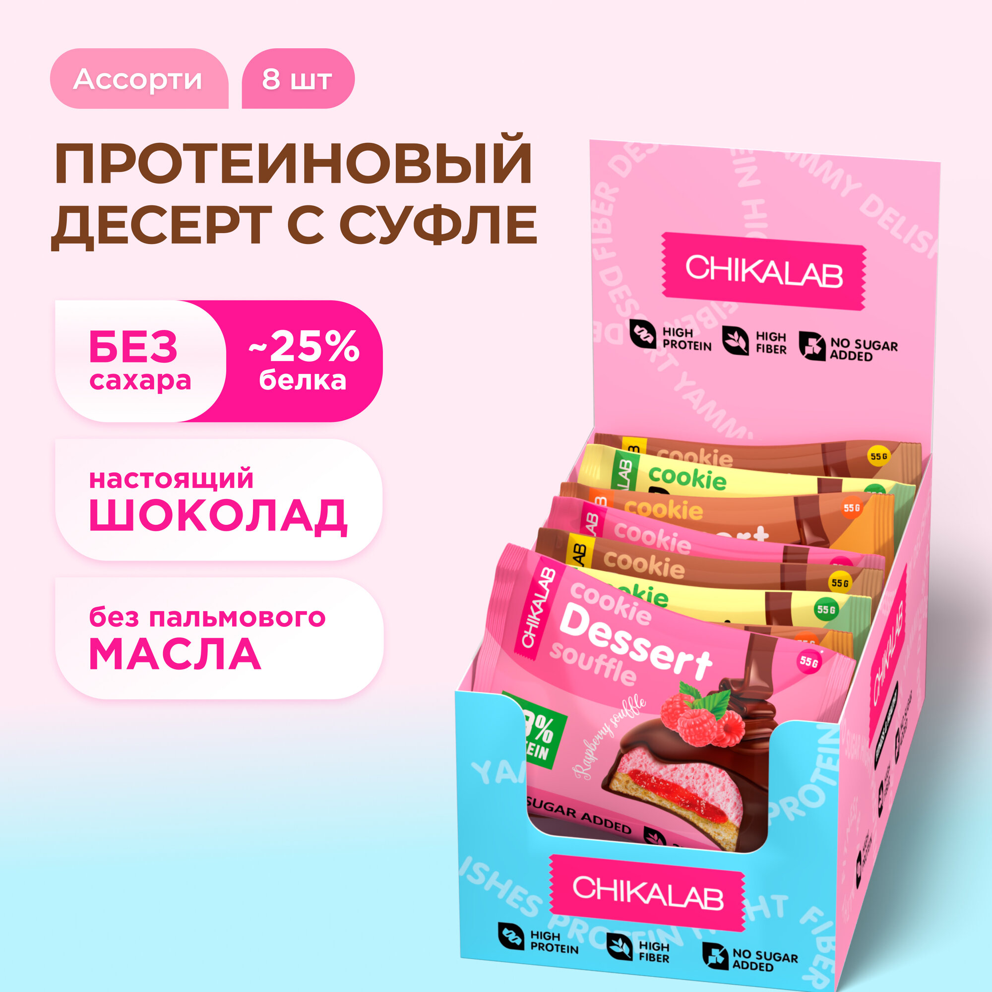 CHIKALAB Протеиновое печенье с суфле в шоколаде без сахара "Ассорти", 8шт х 55г информация: