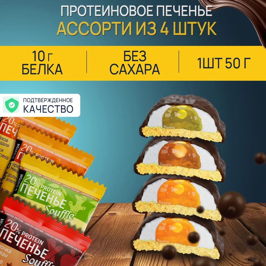 Протеиновое печенье ё/батон с белковым суфле Ассорти (яблоко-корица, лимон-имбирь, миндаль-апельсин) 4 шт по 50 г информация: