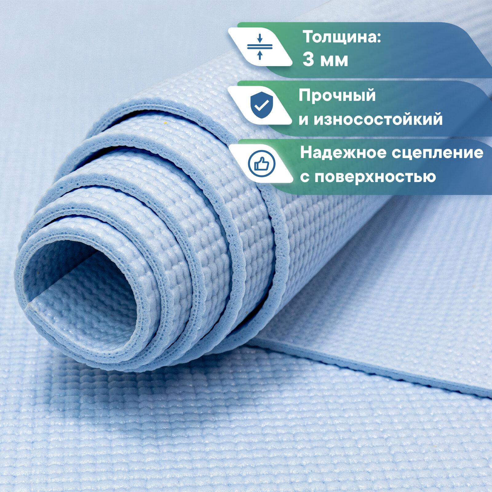 Коврик VILINA спортивный для йоги и фитнеса, растяжки, гимнастики 0,3 см 61х183 см небесно-голубой информация: