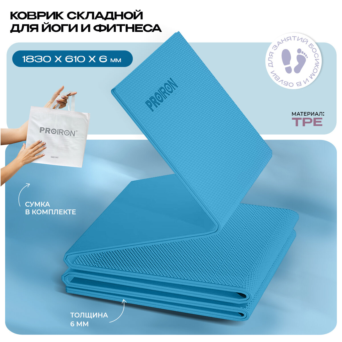 Коврик для фитнеса и йоги нескользящий складной PROIRON, размеры 1830х610х6 мм, материал TPE, синий 1 499 ₽
