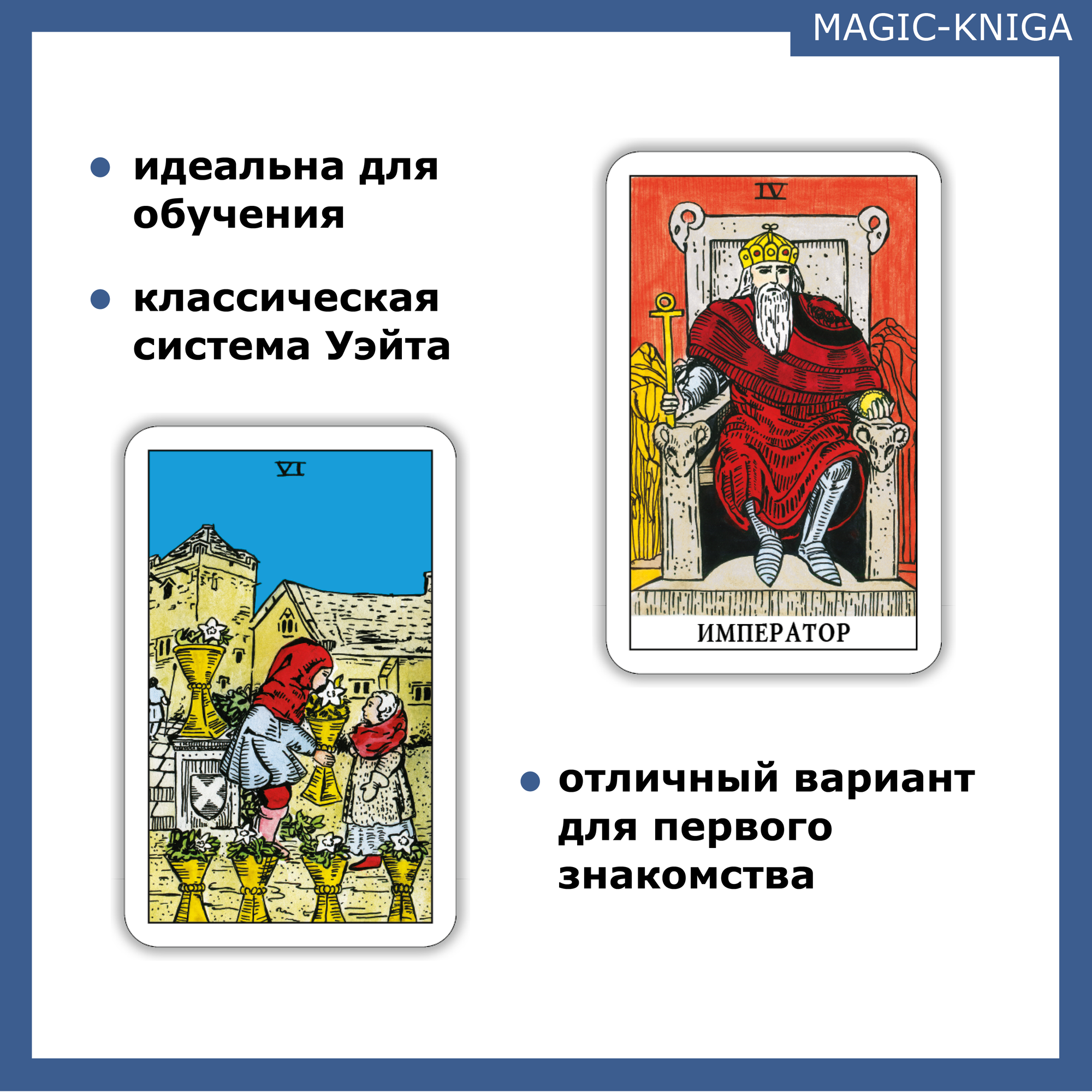 | Подробная комплектация | 78 карт для гадания размером 10,3х6,4 см, книга инструкция 120 страниц, 6 карт с раскладами, коробка с крышкой для хранения |