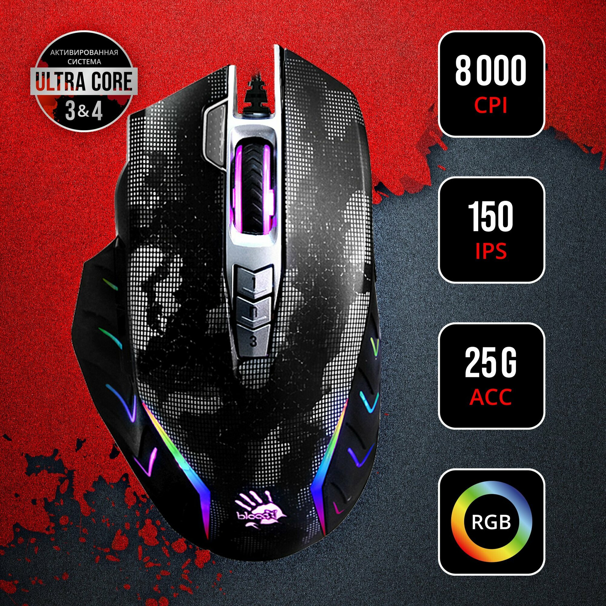 10 цен на Мышь A4Tech Bloody J95s рисунок, оптическая, разрешение сенсора 8000dpi, проводная, длина провода 1.8м, кнопок: 9, подходит для правой руки (J95S SATELLITE ACTIVATED)