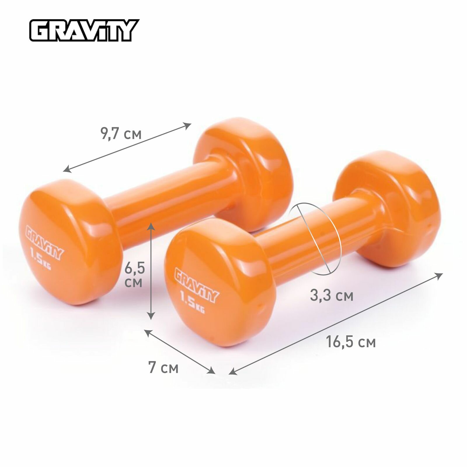 | Комплектация | Гантели с виниловым покрытием Gravity, оранжевые, 1.5 кг, пара |