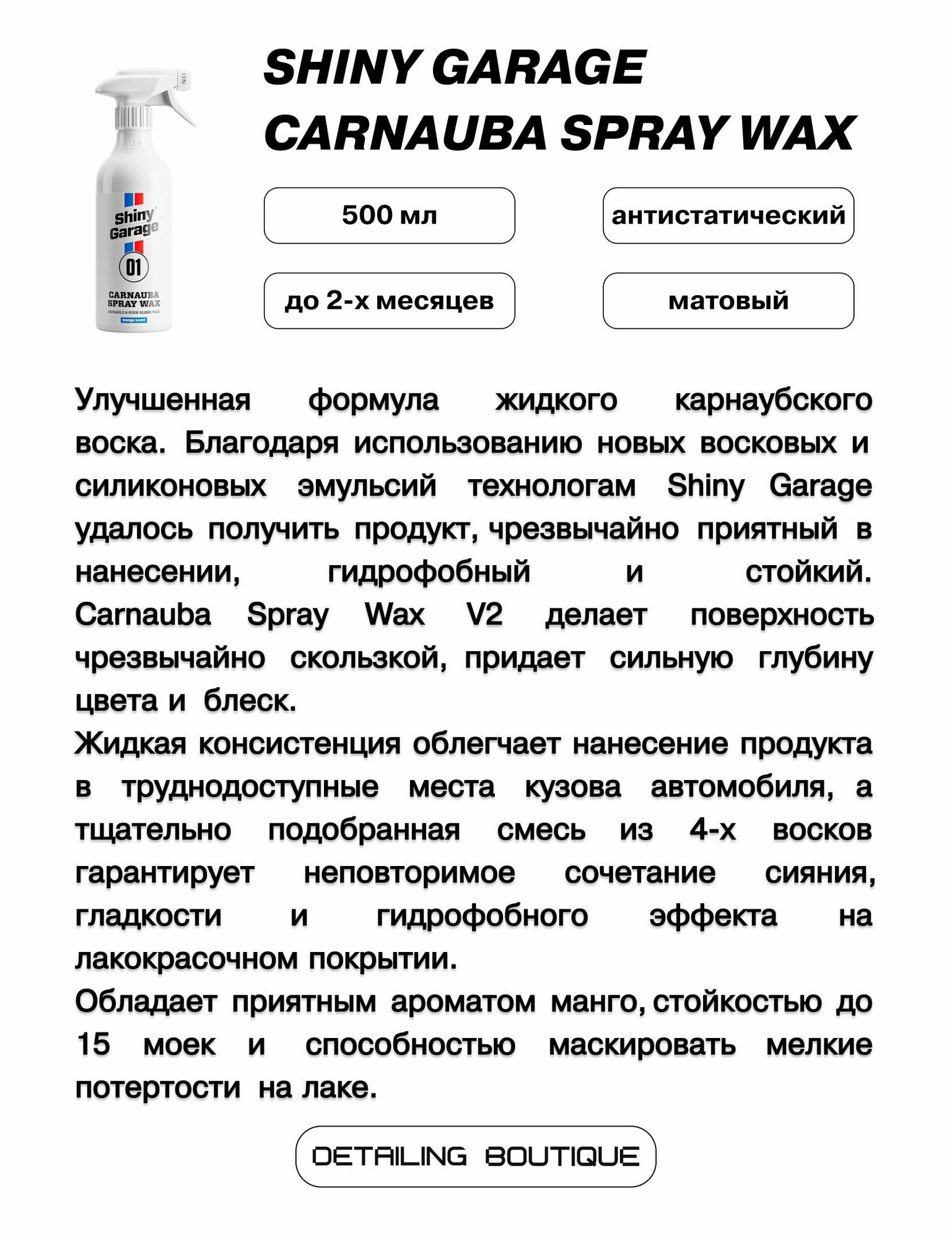 10 цен на Карнаубский спрей воск Shiny Garage Carnauba Spray Wax V2 500мл