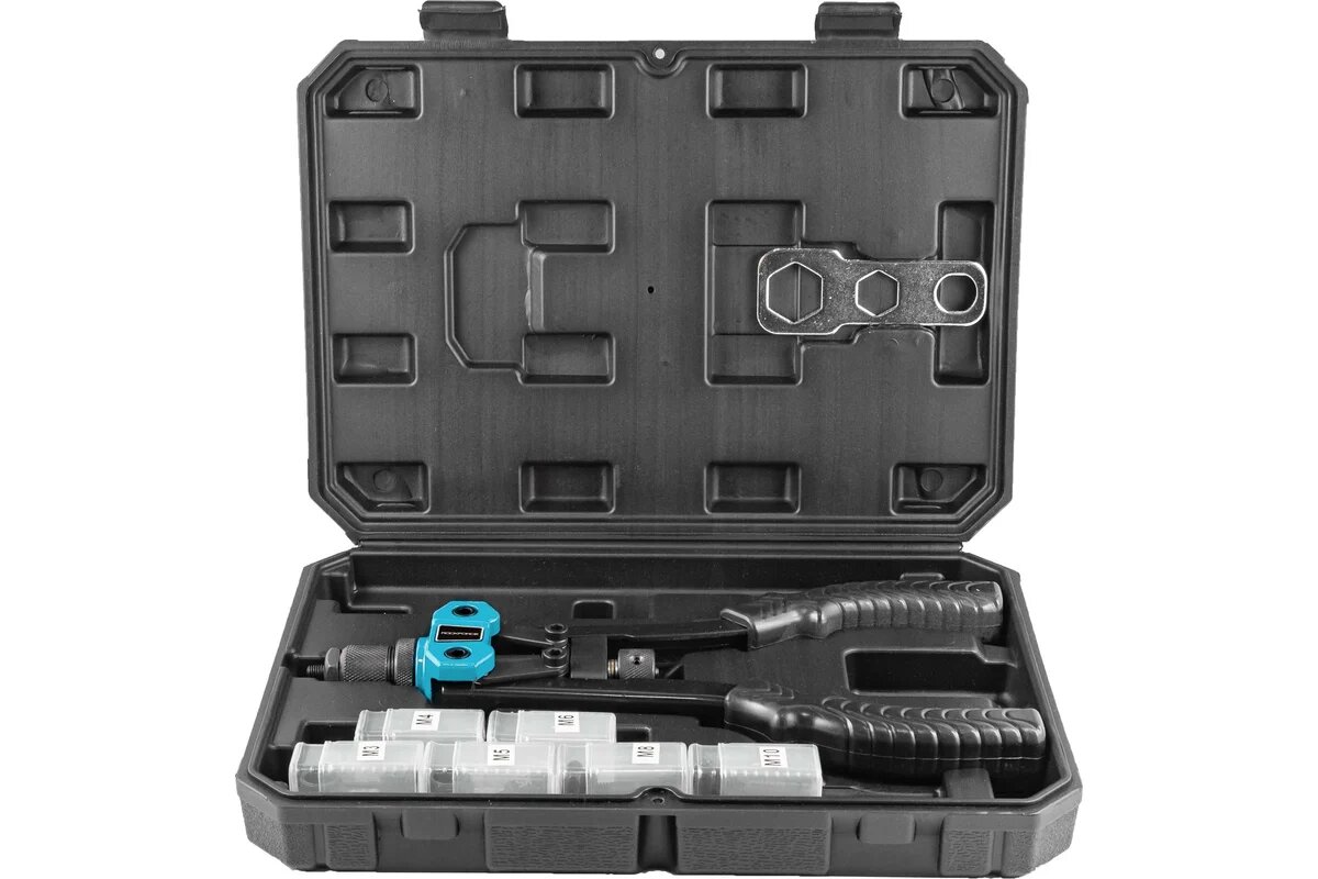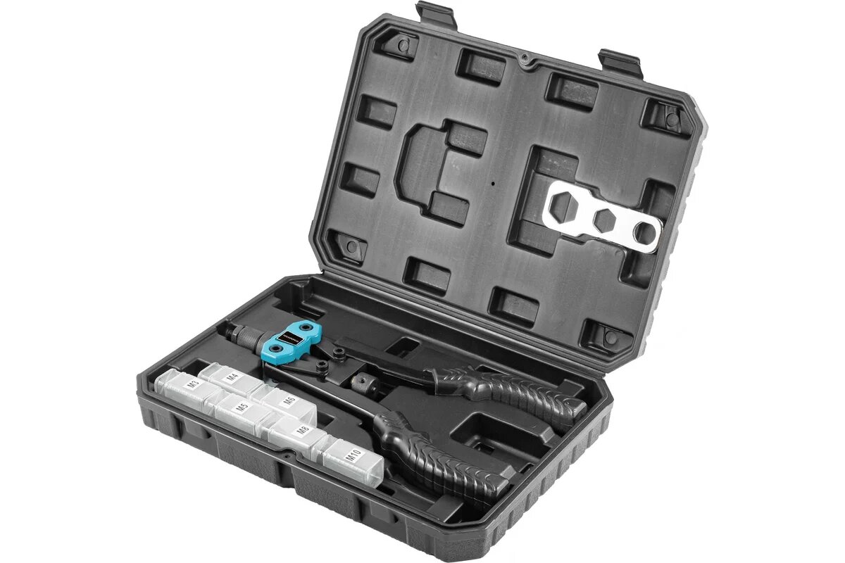 | Подробная комплектация | Заклепочник; Адаптеры M3, M4, М5, М6, М8, М10 по 1 шт. Упаковка. |