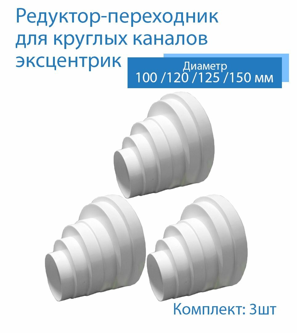 Переходник универсальный экцентрик 80 / 100 / 120 / 125 / 150 мм, редуктор многоступенчатый, 3 шт, 310-3, белый, воздуховод, ПВХ информация: