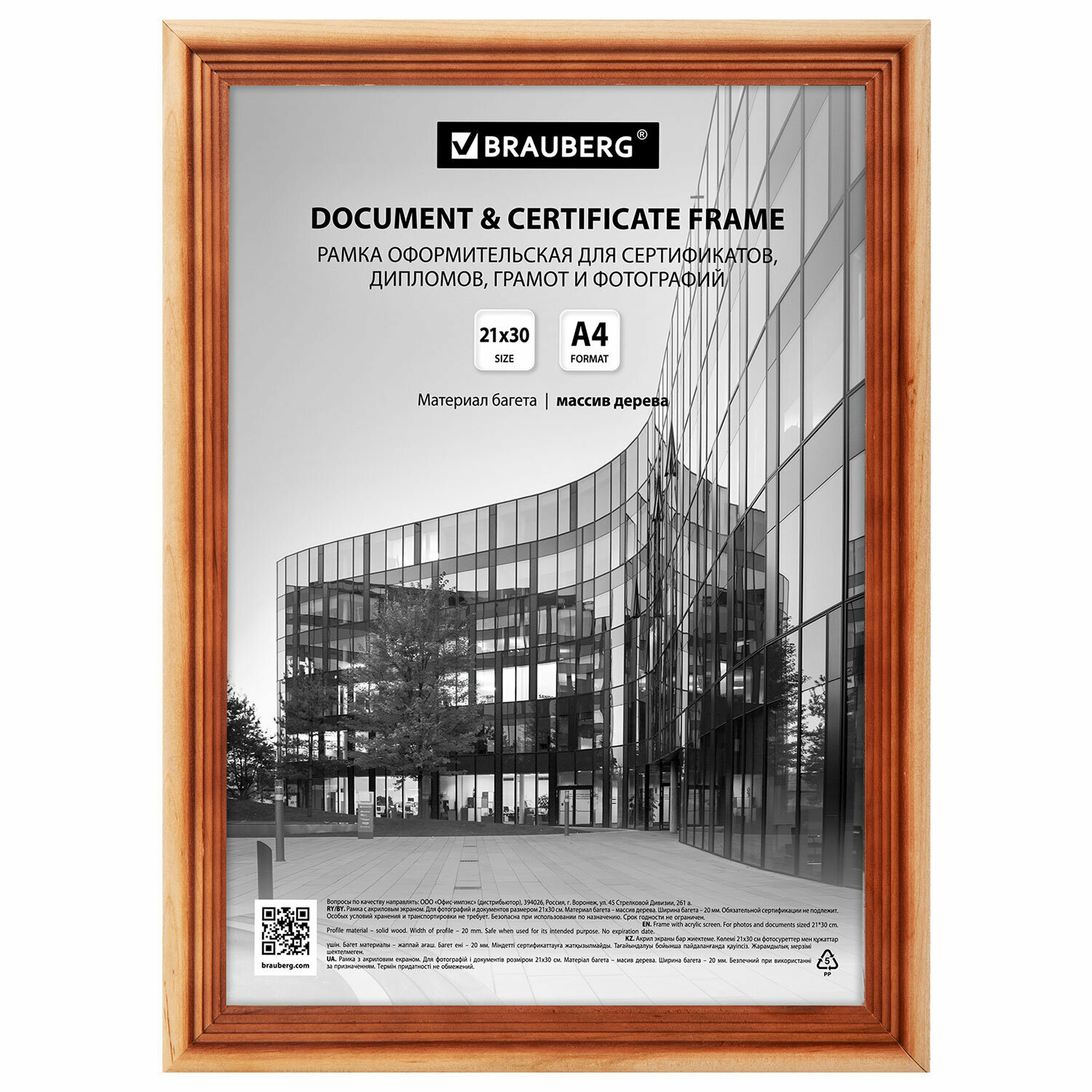 Рамка (фоторамка) для фотографий / картин / сертификата / диплома / грамот А4 21х30см, дерево, багет 20мм, акриловый экран, Brauberg Business, 391292