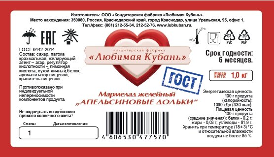 Мармелад Апельсиновые дольки 1кг на агаре Любимая Кубань информация: