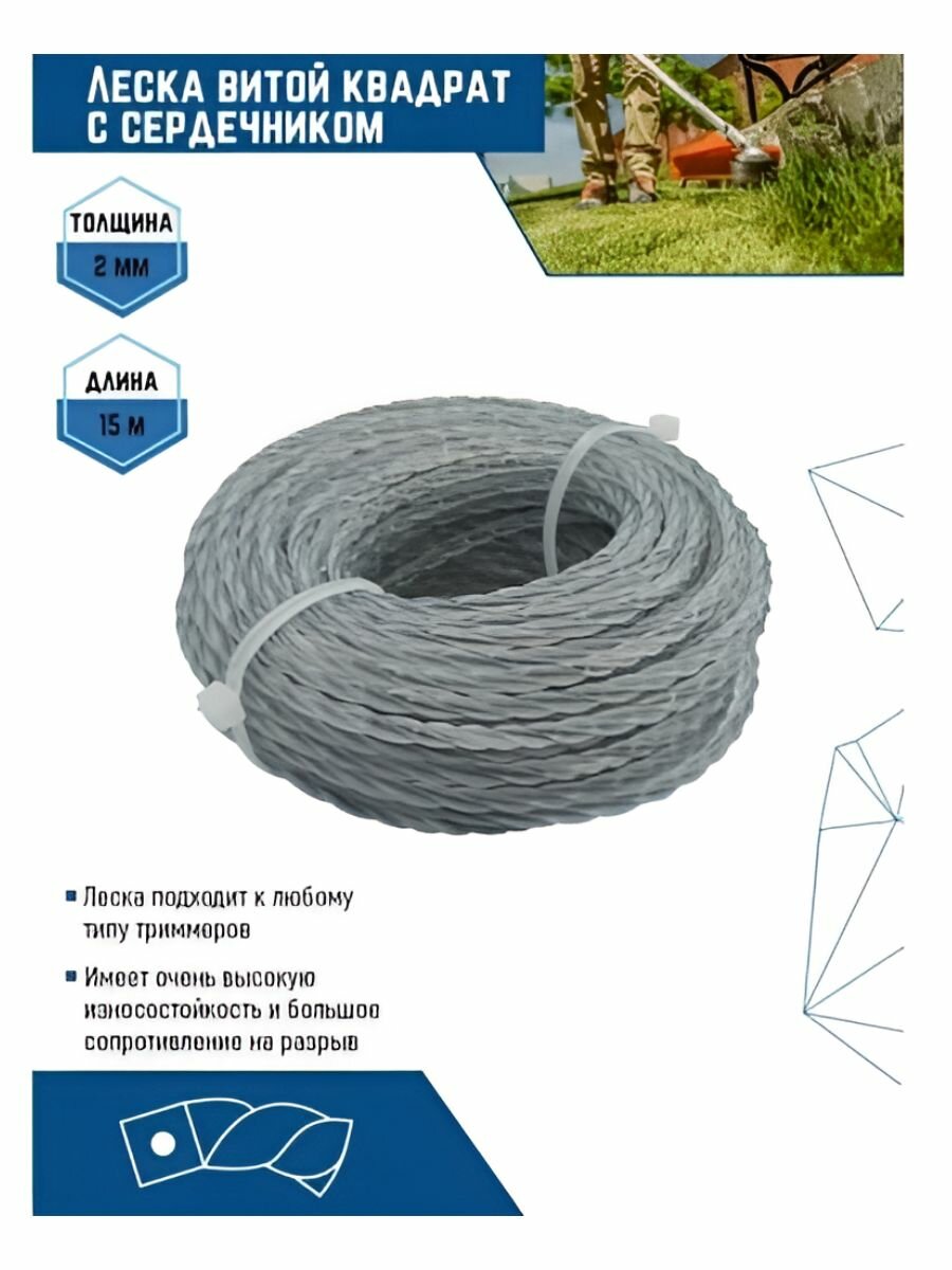 Леска для триммера, 2мм, витой квадрат с сердечником 15м, VERTEXTOOLS информация: