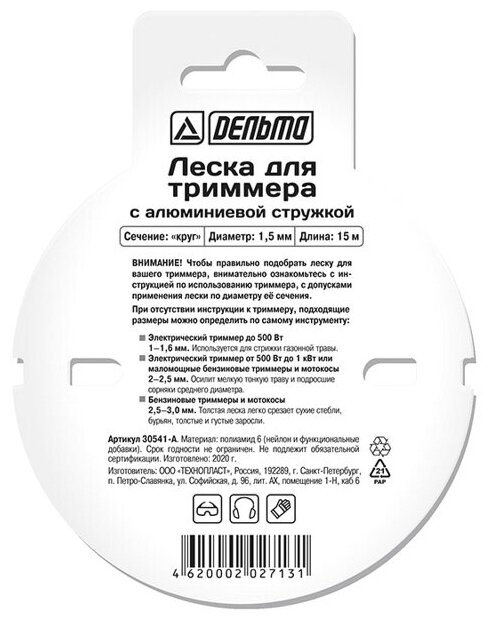 | Дополнительная информация | Леска для триммеров армированная, 2,5 мм, 15 м, круг |
