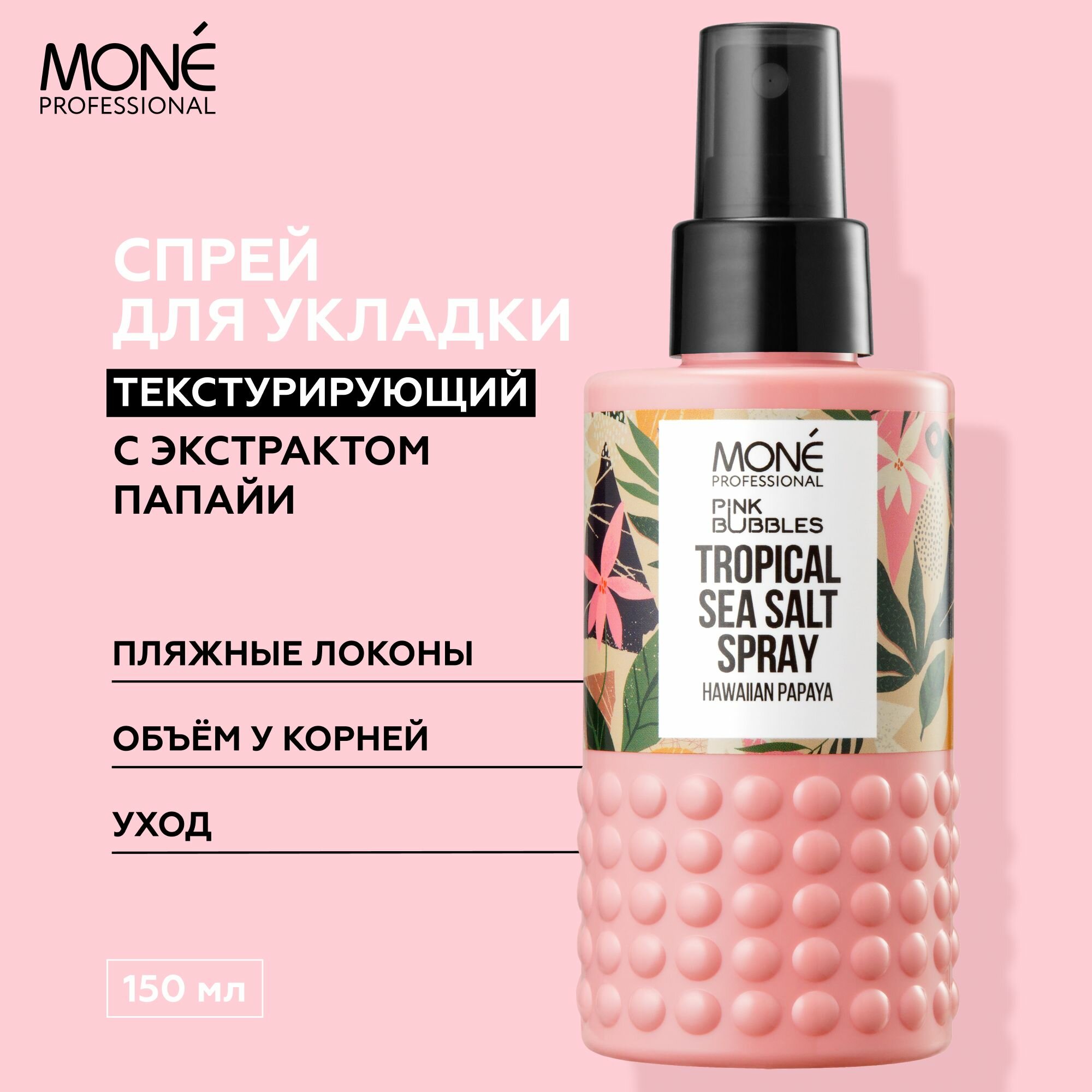 MONE PROFESSIONAL Уходовый текстурирующий стайлинг спрей с экстрактом папайи и морской солью для прикорневого объема, долговременной укладки и фиксации локонов, устранения пушистости сухих волос информация: