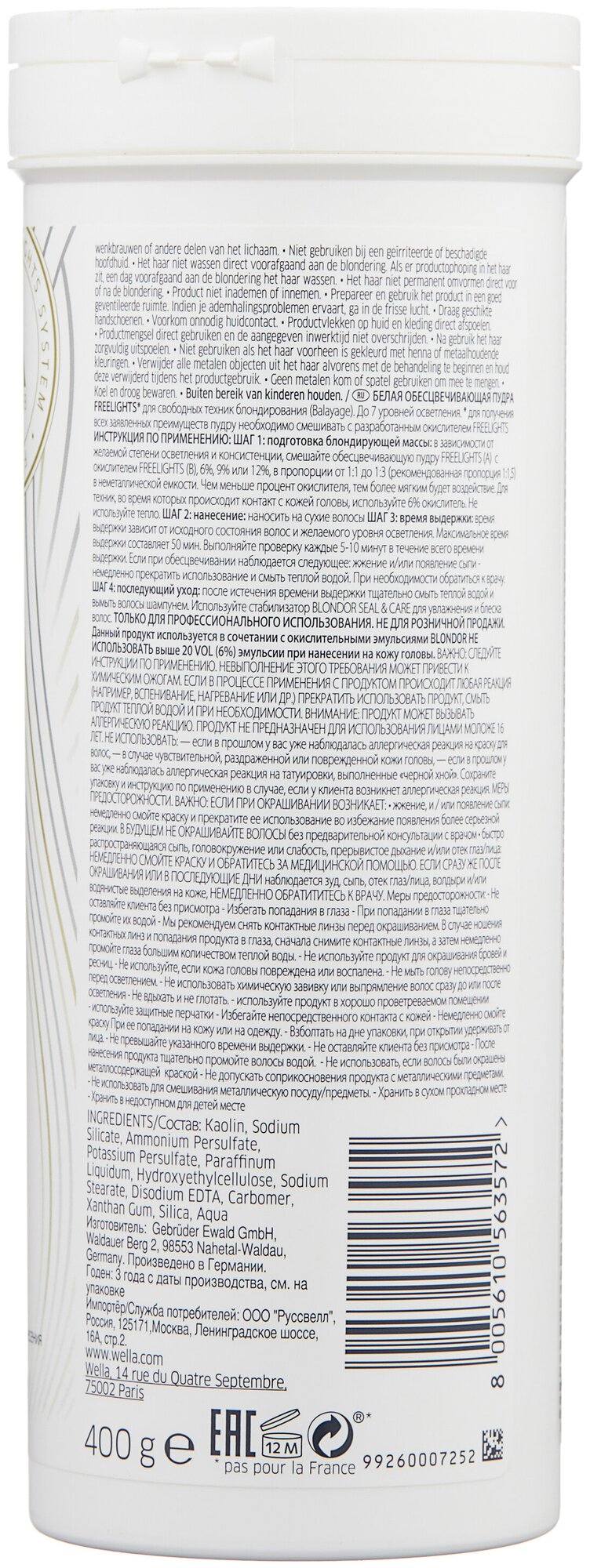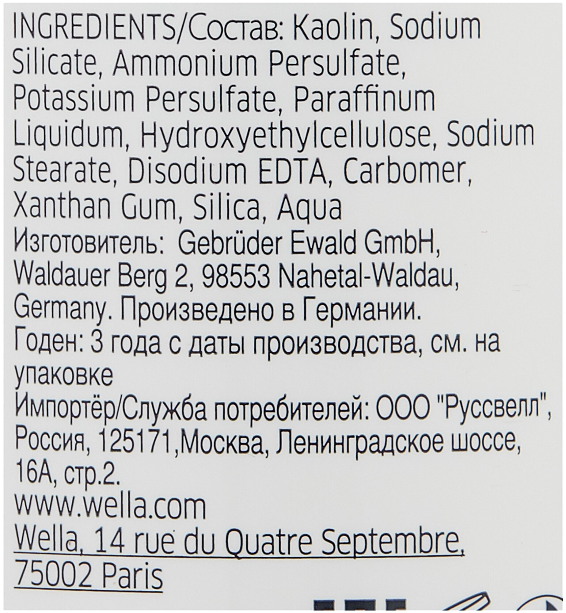 | Дополнительная информация | данный продукт используется только в комбинации со средством для обесцвечивания Wella Blondor. Не наносите данный продукт непосредственно на волосы |