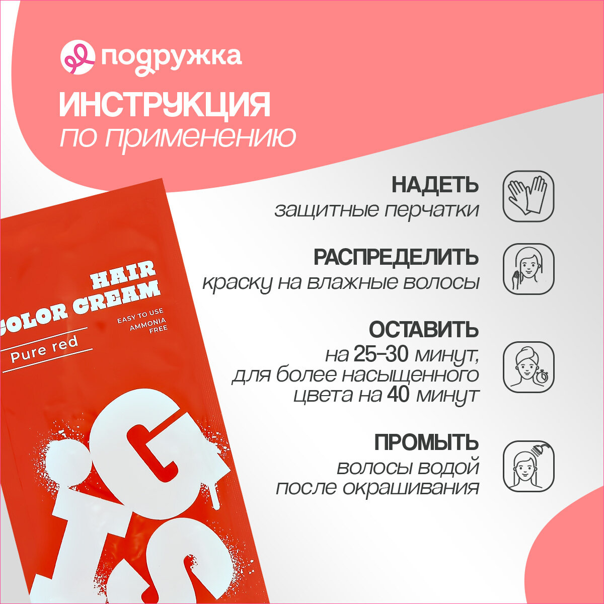 | Способ применения | Надеть защитные перчатки. Распределить краску на вымытые, влажные и подсушенные полотенцем волосы. Оставить на волосах на 25–30 минут, для получения более насыщенного цвета — 40 минут. После окрашивания тщательно промыть волосы водой. Высушить волосы. |