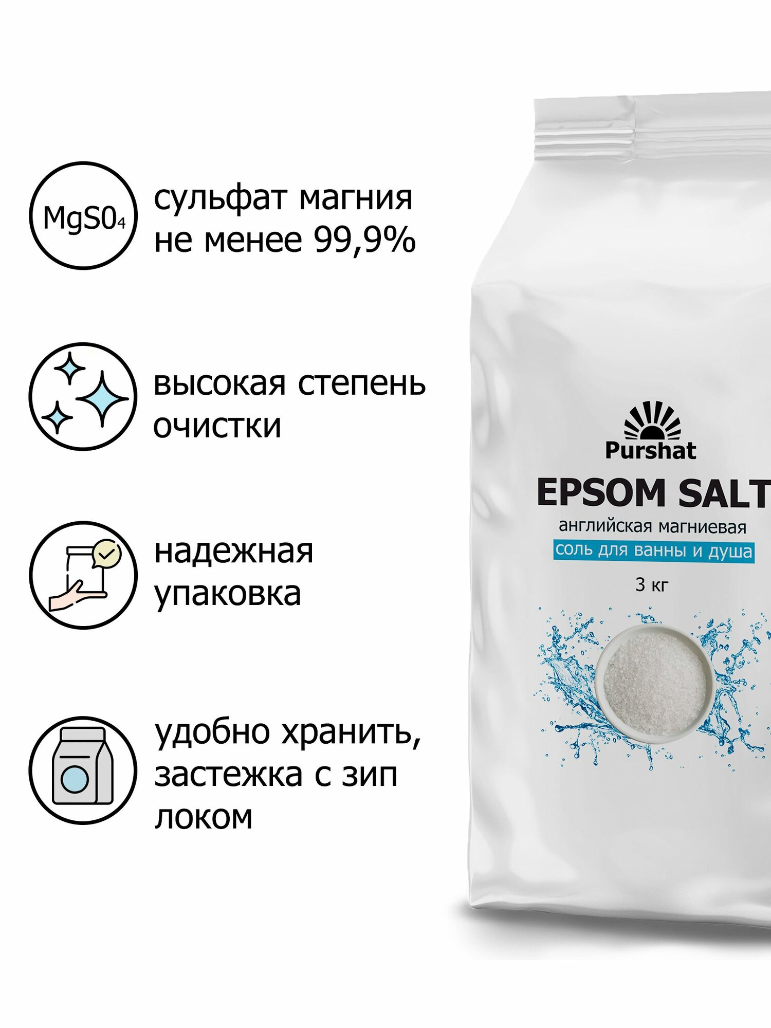 Английская магниевая соль для ванны и душа Epsom Purshat 3 кг - натуральный SPA-комплекс для здоровья 848 ₽