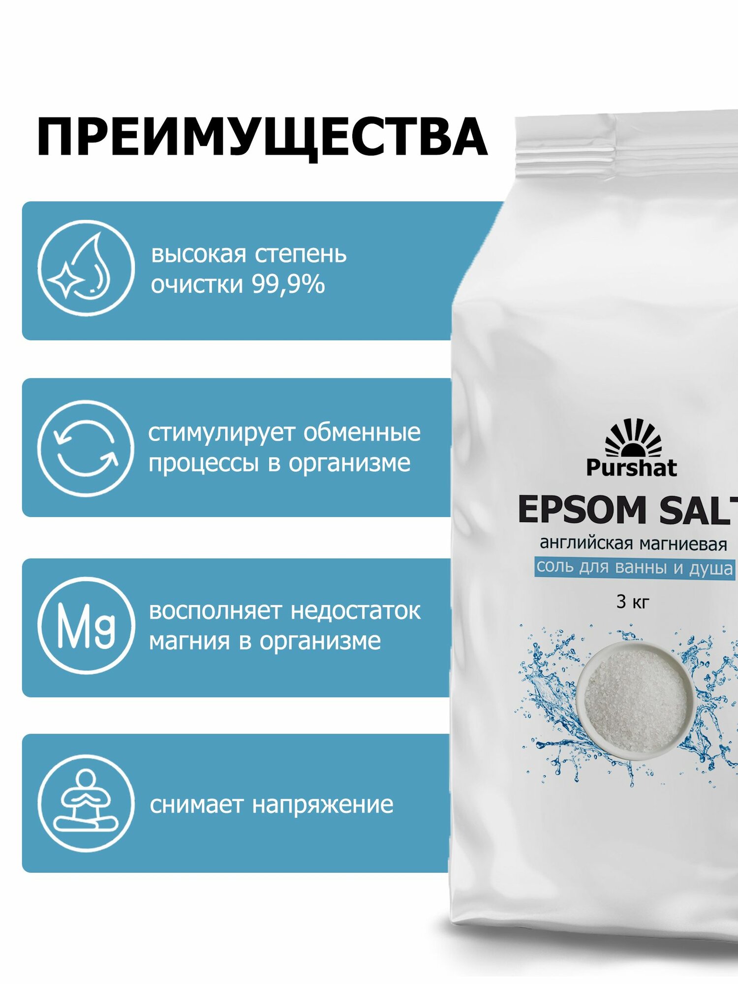 Английская магниевая соль для ванны Epsom Purshat 3 кг информация: