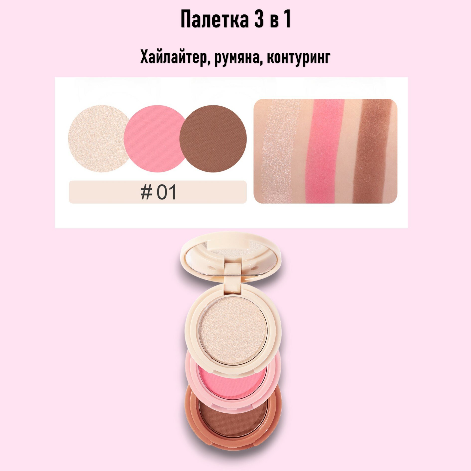 Палетка для контуринга 3 в 1 хайлайтер, румяна, контуринг Тон № 1 информация: