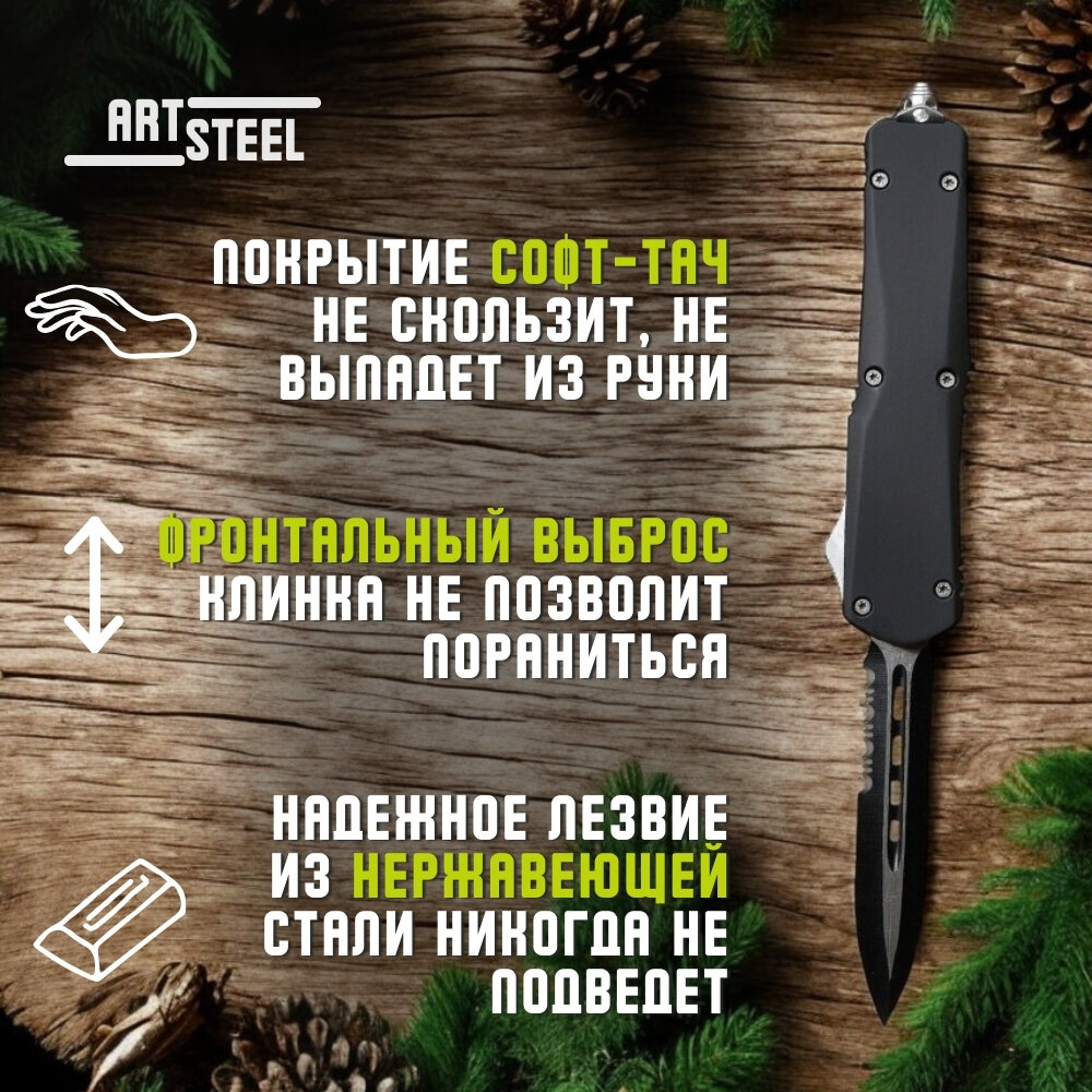 10 цен на Автоматический складной нож Тирекс (фронтальный) с серрейтором, ArtSteel, сталь 440, рукоять алюминий, черный, серрейтор
