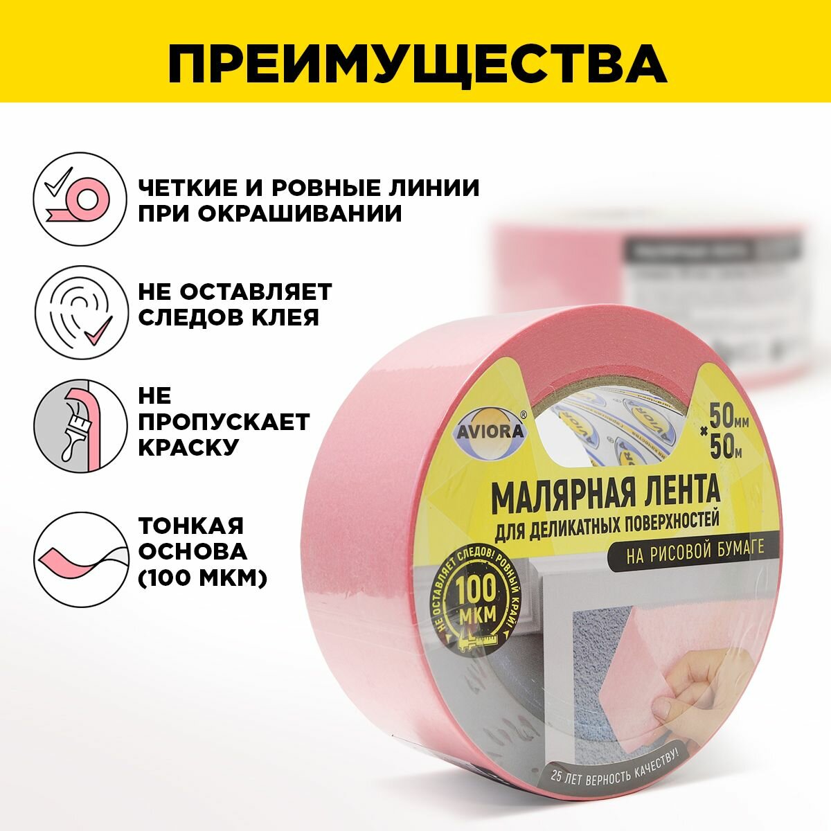 Малярная лента для деликатных поверхностей на рисовой бумаге 50мм х 50м, AVIORA (304-078) информация: