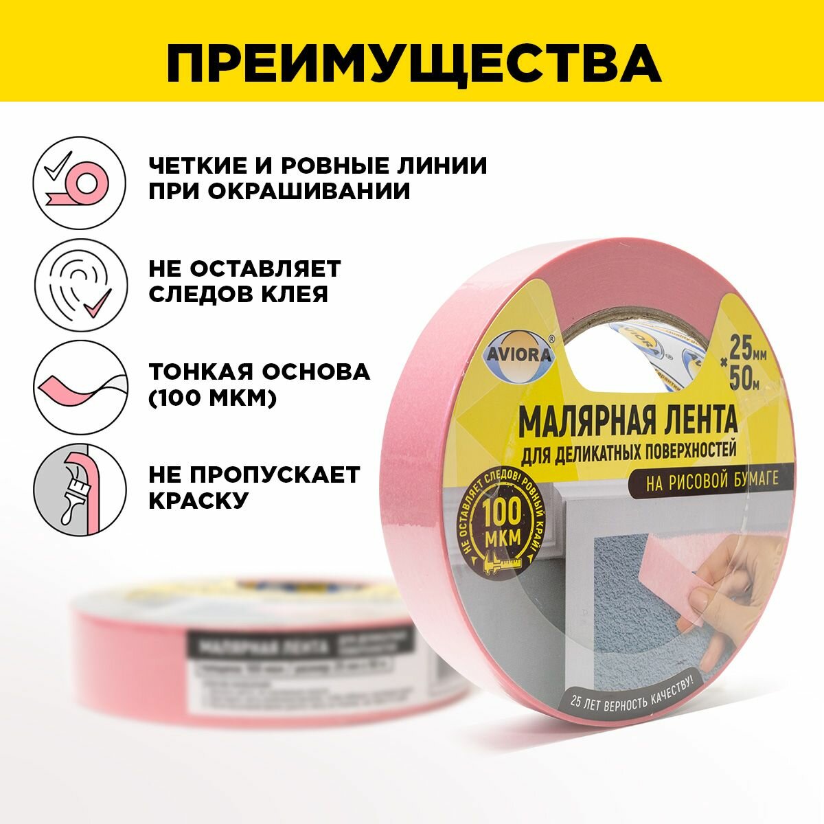 Отзывы на Малярная лента для деликатных поверхностей на рисовой бумаге 25мм х 50м, AVIORA (304-077)