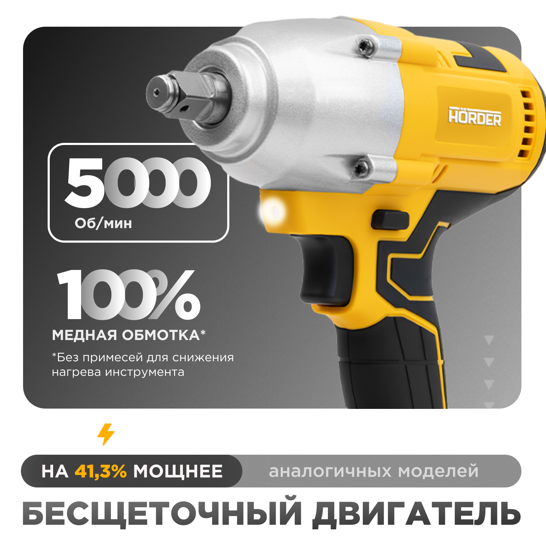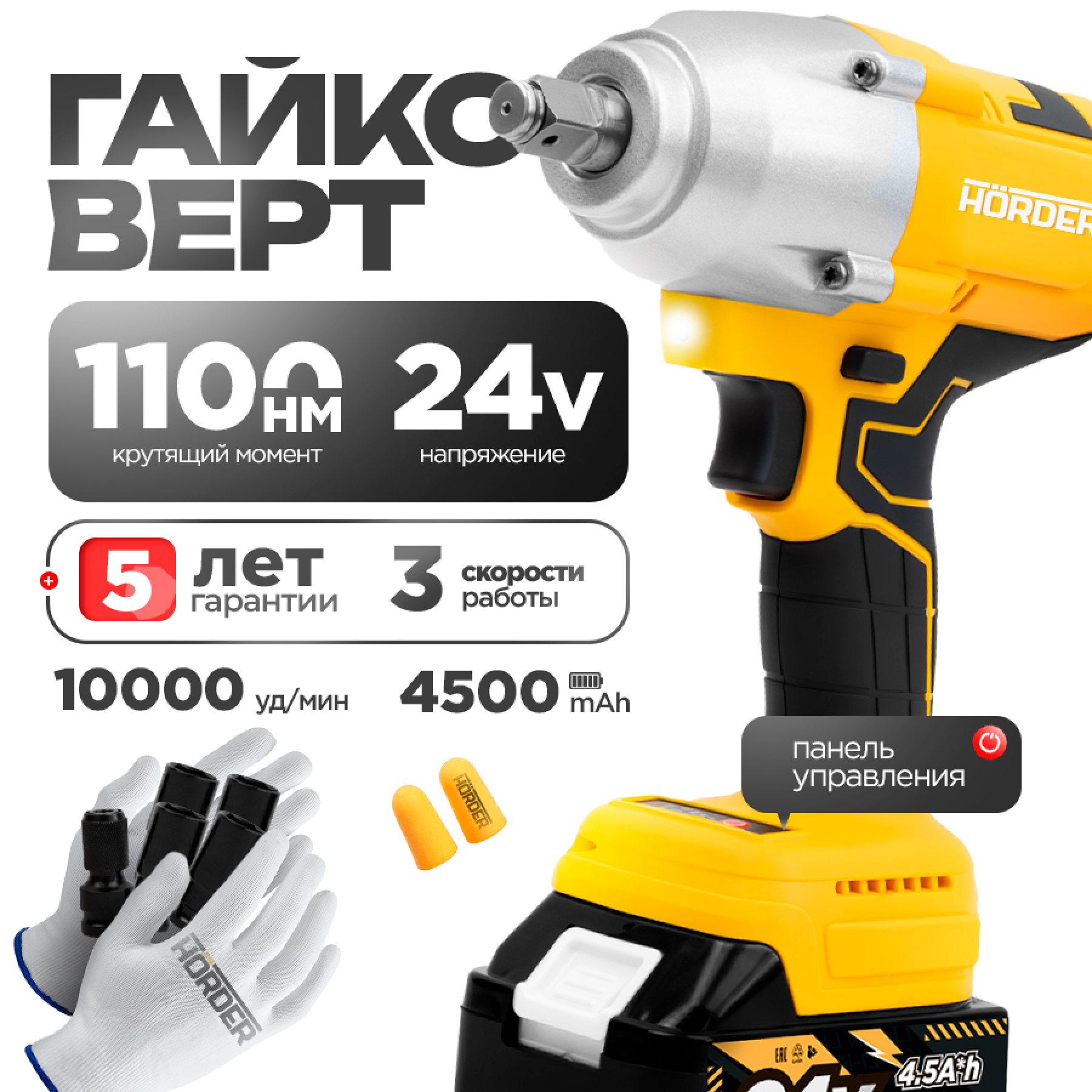 Гайковерт аккумуляторный HORDER HW-1100 Li1 ECO бесщеточный ударный, 24 В 4.5 Ач, 1100 Нм, 5000 об/мин 3 скорости, головки, подвесная ручка + ремень, перчатки информация: