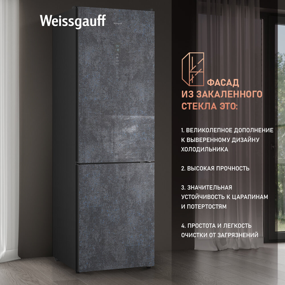 Холодильник Weissgauff WRK 195 D Full NoFrost Rock Glass двухкамерный ширина 60 см, 3 года гарантии, Стеклянный фасад, Тихий режим, Большой объём, Сенсорное управление, Дисплей, Супер заморозка, Супер охлаждение, LED освещение информация:
