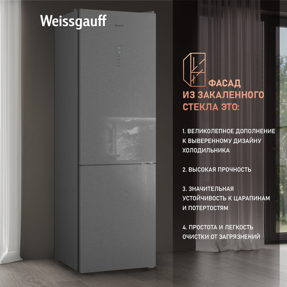 Холодильник Weissgauff WRK 195 D Full NoFrost Inox Glass двухкамерный Стеклянный фасад, 3 года гарантии, высота 195,3 см, ширина 60 см, Тихий режим, Большой объём, Сенсорное управление, Дисплей, Супер заморозка, Супер охлаждение, LED освещение информация:
