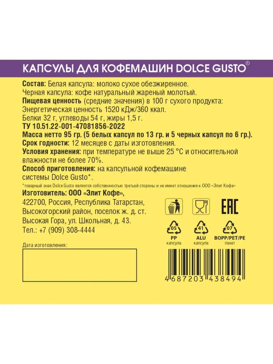 | Состав | Белая капсула: молоко сухое обезжиренное;черная капсула: кофе натуральный жареный молотый |