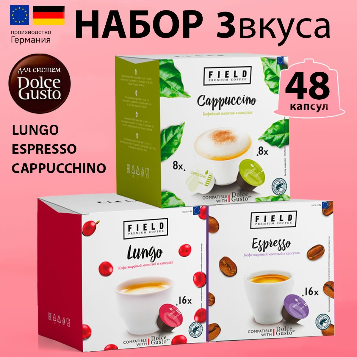 Кофе капсулы Field Dolce Gusto Cappuccino Espresso Cafe au Lait набор 48шт 2 068 ₽