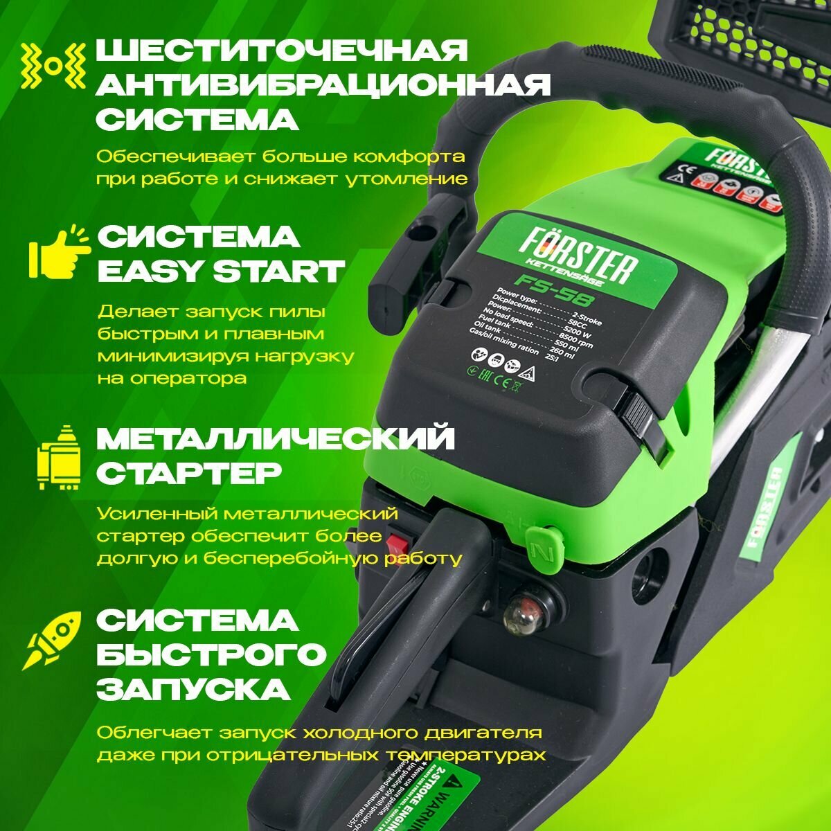 Бензопила FORSTER FS-58/пила цепная бензиновая/2 шины+2цепи в комплекте информация: