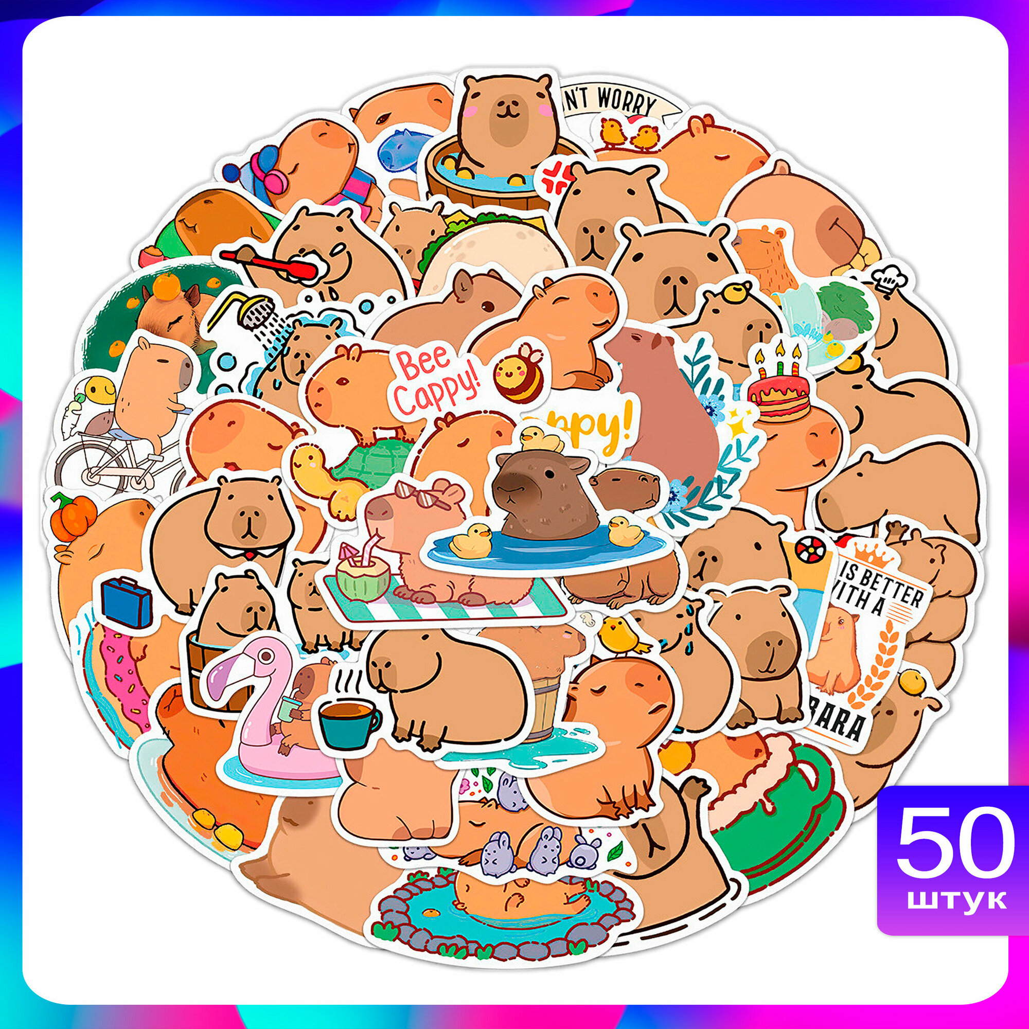 10 цен на Наклейки-стикеры "Капибара", 50 штук. Наклейки виниловые на ноутбук, телефон. Стикерпак с животными для скрапбукинга, мемы