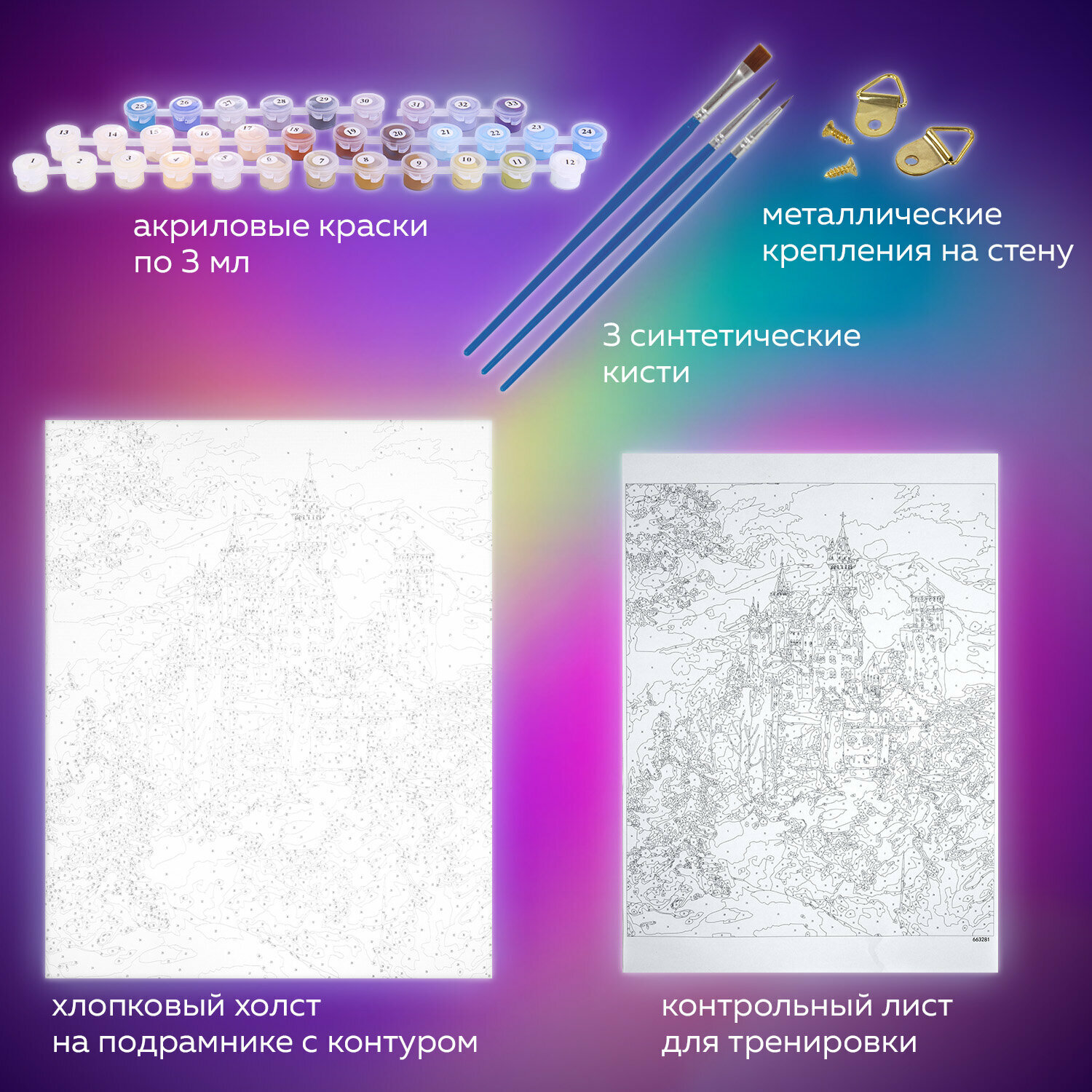| Комплектация | 1 хлопковый холст на подрамнике с контуром, 1 лист бумаги для тренировки, 26 акриловых красок объемом 3 мл каждая, 3 синтетические кисти и комплект металлических креплений для подвешивания на стену |