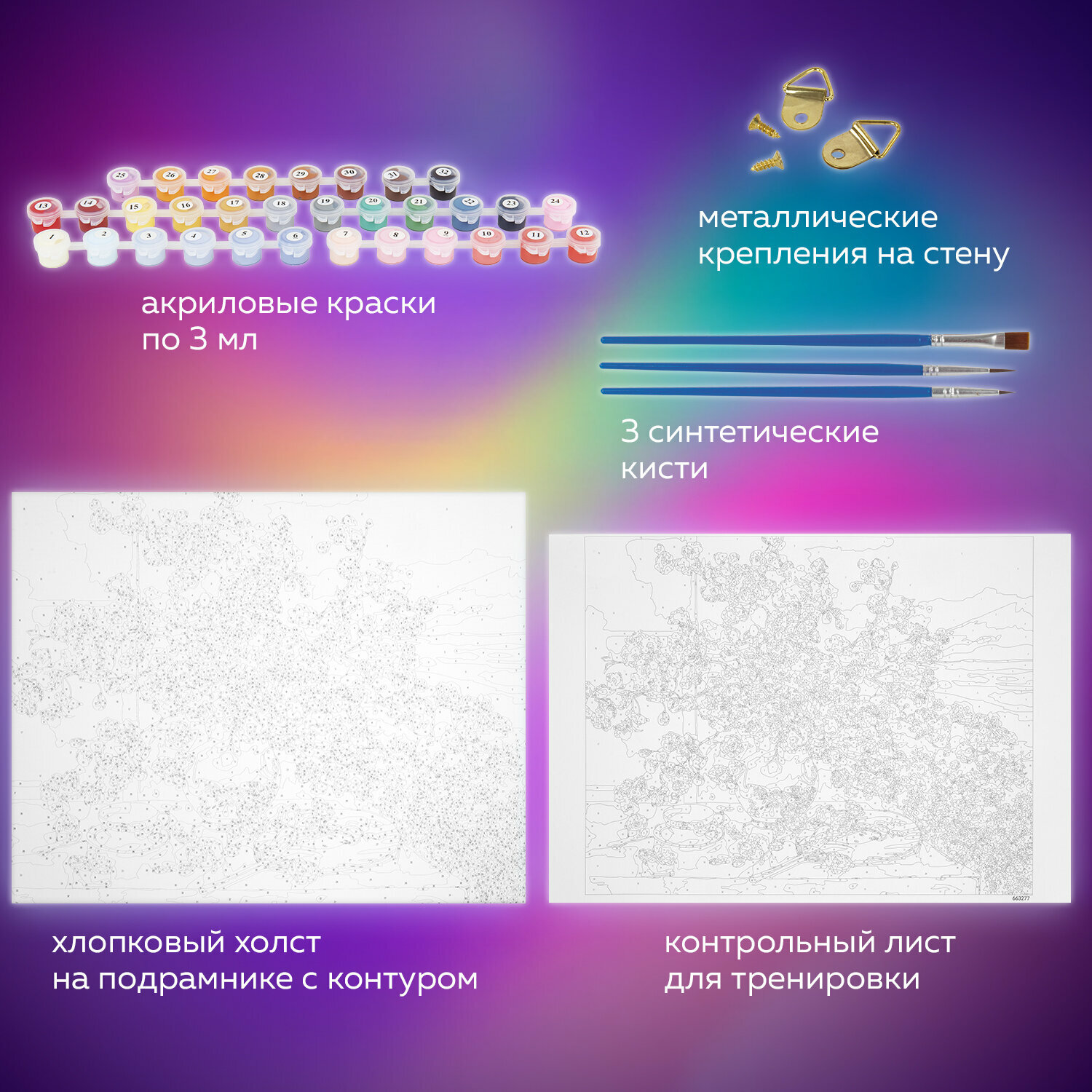 | Комплектация | 1 хлопковый холст на подрамнике с контуром, 1 лист бумаги для тренировки, 26 акриловых красок объемом 3 мл каждая, 3 синтетические кисти и комплект металлических креплений для подвешивания на стену |