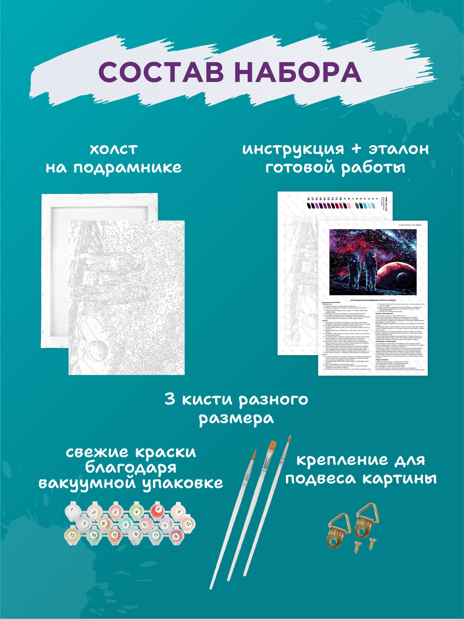 | Комплектация | холст на подрамнике, акриловые краски в пронумерованных баночках, три кисти разного размера, инструкция с контрольным листом и эталоном готовой картины |