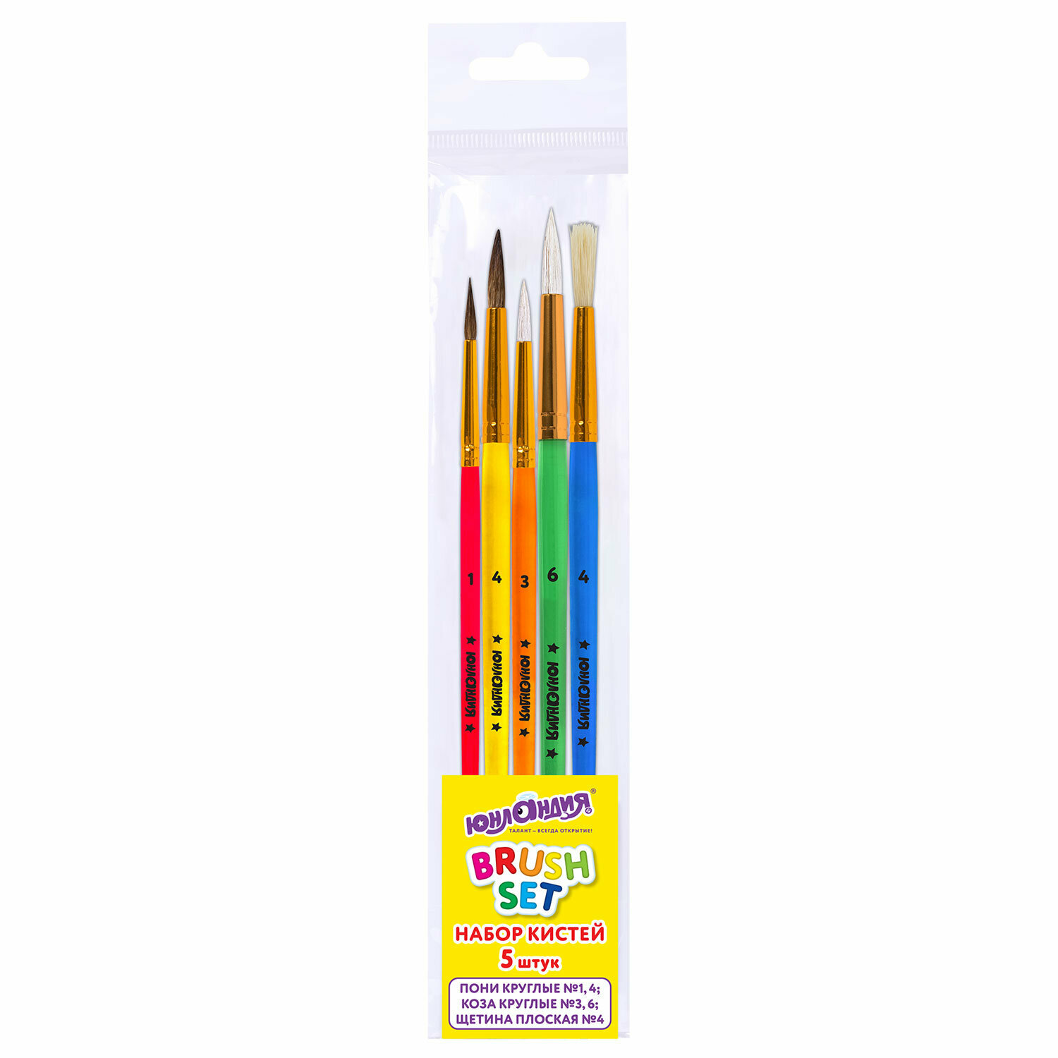 Кисти для рисования в школу набор 5 штук, кисточки круглые и плоские, коза, щетина, пони, Юнландия, 201079 информация: