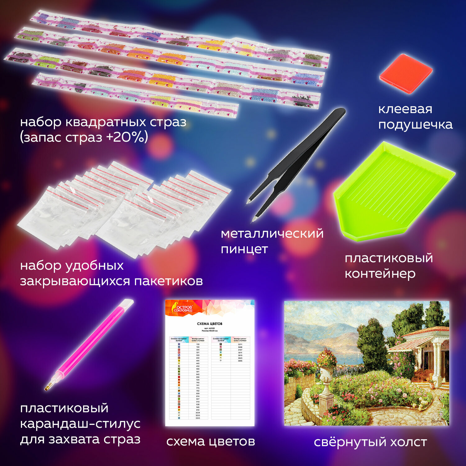 | Комплектация | холст, стразы, контейнер, стилус, клеевой квадрат, пинцет, схема |