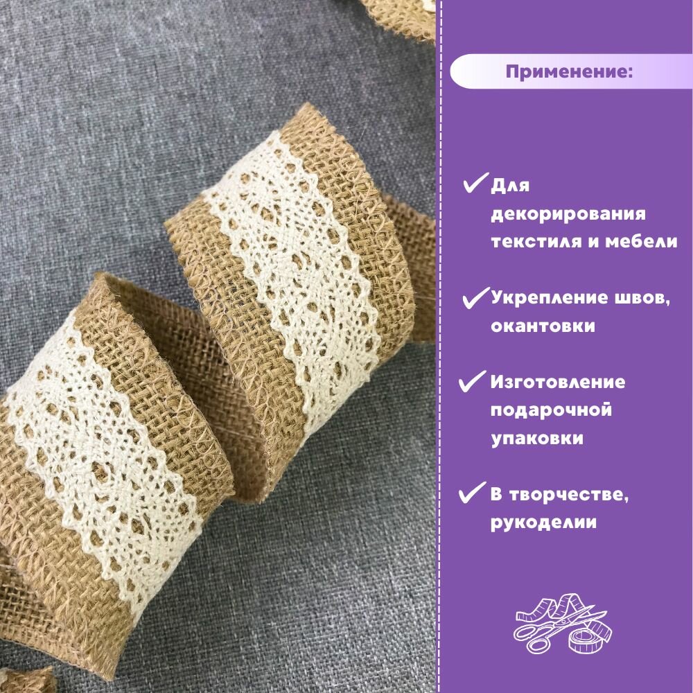 Лента декоративная из джута/лента из мешковины/ тесьма из мешковина с кружевом, ширина 50 мм, длина 2 метра информация: