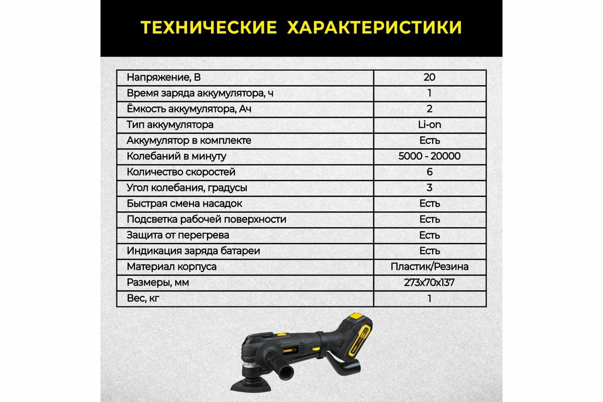Аккумуляторный реноватор TECHNICOM 20В, 2Ач, 5000-20000 кол/мин, 6 скоростей, 3° угол колебания TC-CM620 информация: