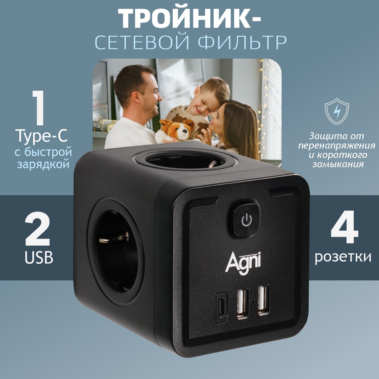 10 цен на Разветвитель с защитой по типу сетевого фильтра AGNI тройник 4 розетки, 2 USB порта 2.4A, Type-C 20Вт (быстрая зарядка) заземление, шторками, 16A/4кВт(черный)