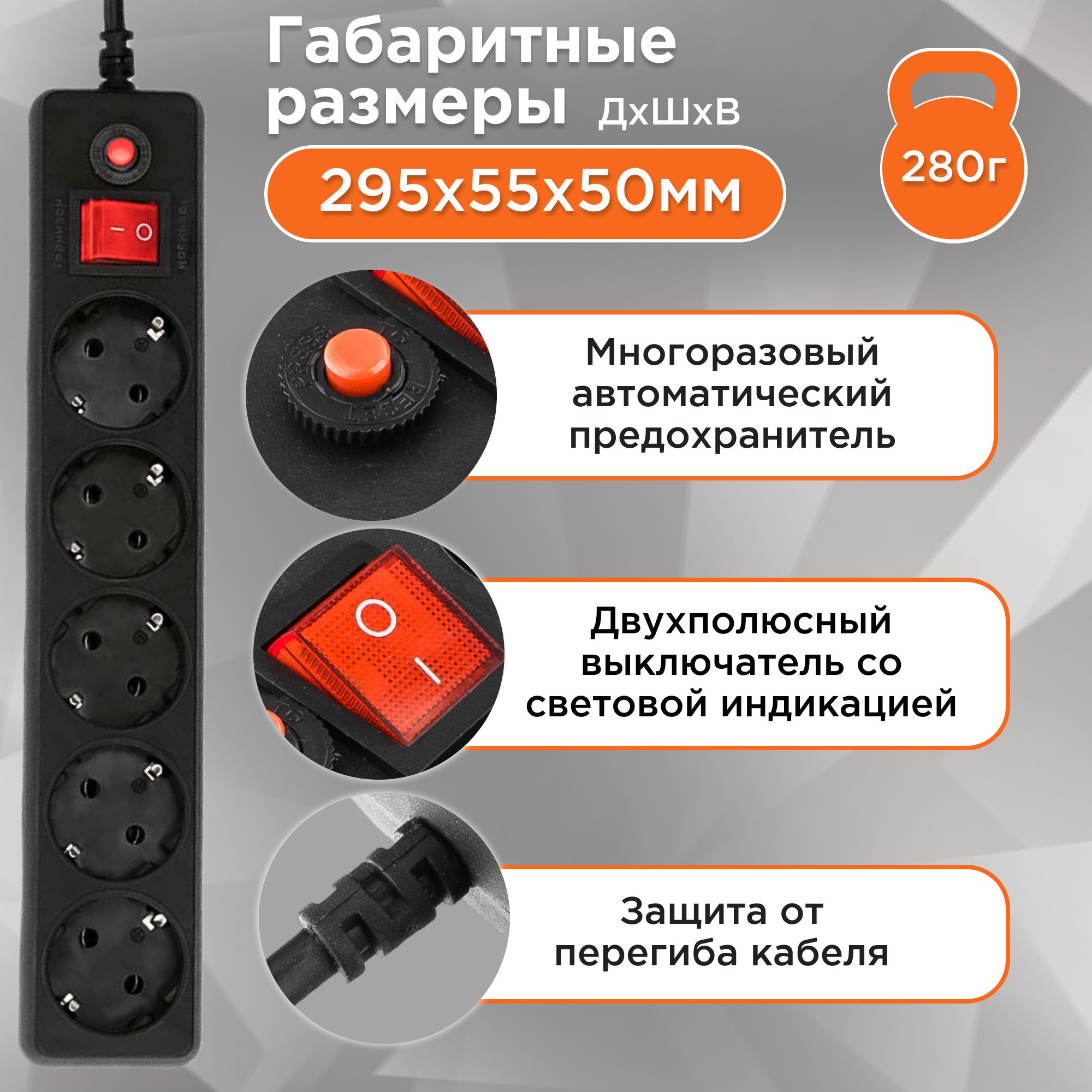 Гарнизонный сетевой фильтр 5 розеток, 10 ампер, 5 метров, черный информация: