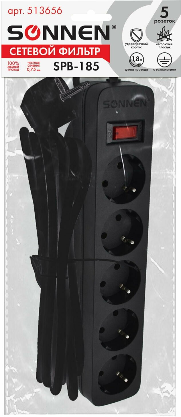 Сетевой фильтр SONNEN SPB-185, 5 розеток с заземлением, выключатель, 10 А, 1,8 м, черный, 513656