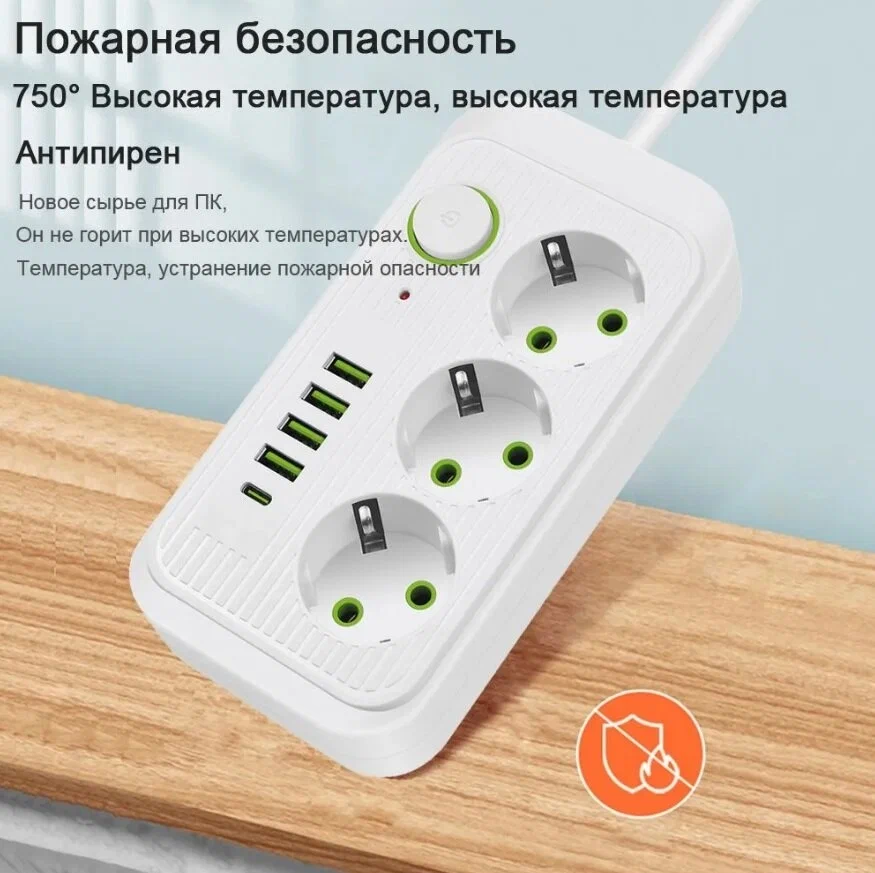 Сетевой фильтр с 6 розетками 4 USB +2 Type-C / Многофункциональный удлинитель с предохранителем SUPERNOWA
