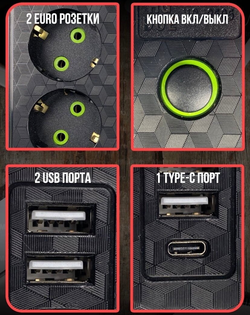 Удлинитель сетевой 6 розеток, 4 входа для USB, 2 type-c порта от GadFamily!