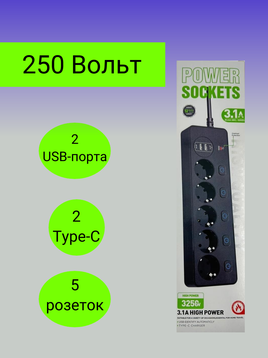 Отзывы на Сетевой удлинитель 5 розеток, 2 USB, 2 Type-C черный от GadFamily_Shop