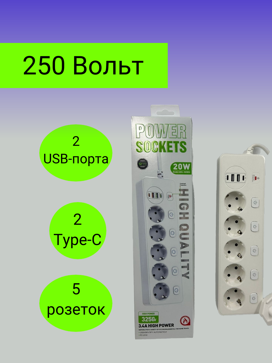 Отзывы на Сетевой удлинитель 5 розеток, 2 USB, 2 Type-C белый от GadFamily_Shop