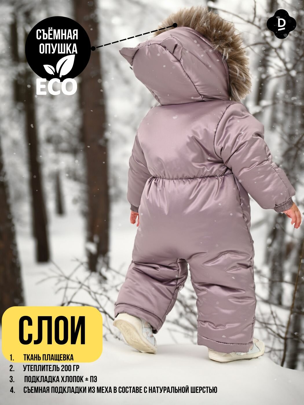 | Особенности модели | ветрозащита, капюшон, манжеты, мембрана, пинетки в комплекте, подкладка, съемный капюшон, съемный мех |